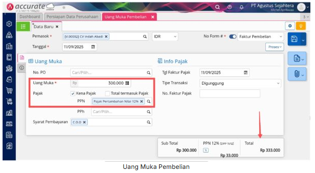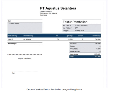 Transaksi Pembelian dengan membayarkan uang muka sebesar Rp 333.000 (termasuk PPN 12%) dan digunakan untuk pembayaran pada Faktur Pembelian sebesar Rp 777.000 (termasuk PPN 12%). Dan ingin menampilkan Nilai Uang muka Pembelian dan Nilai Sisa Hutang setelah dikurangi oleh nilai Uang Muka Pembelian pada desain cetakan faktur pembelian.