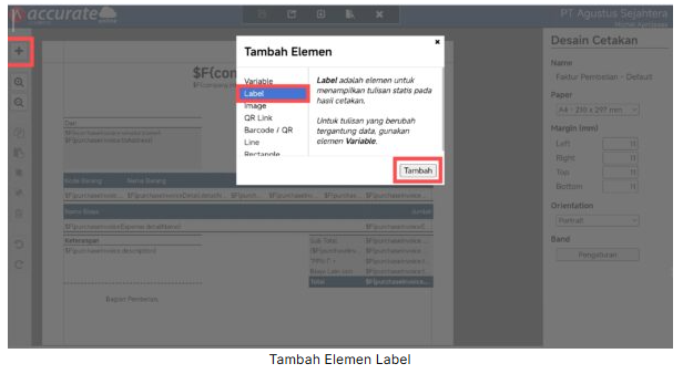 4. Pada tampilan Desainer, Tambah Elemen Label dengan klik tombol (+), pilih Label, dan klik Tambah. Letakkan Label tersebut sesuai dengan kebutuhan Anda. Jika ingin ditampilkan sebelum kolom Total, geser kolom Total terlebih dahulu sehingga tersedia ruang kosong dan letakkan kolom label di di ruang kosong tersebut.