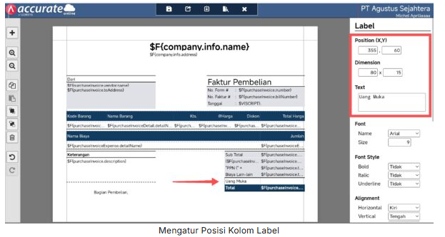 5. Lakukan pengaturan pada elemen label tersebut dengan mengatur Position dan Dimensionnya sesuai dengan kebutuhan. Kemudian tambahkan nama label di kolom Text dengan nama yang sesuai, misalnya Uang Muka.