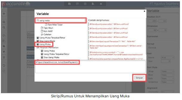7. Selanjutnya, klik 2 kali pada kolom variable tersebut, maka tampil kotak Variable. Pada kotak pencarian variable, ketikkan Uang Muka, dan klik variable Uang Muka, sehingga tampil skrip/rumus : $F{purchaseInvoice.totalDownPayment} pada kolom Expression di variabel baru yang ditambahkan tersebut (poin 6).
