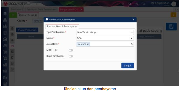 2. Pada jendela ‘Rincian Akun & Pembayaran’ isikan Nama Pembayaran atas transaksi Non-Tunai tersebut dan pilih Nama Akun untuk menampung nilai pembayaran atas transaksi non tunai tersebut. Tipe Akun yang bisa dipilih adalah Kas/Bank.