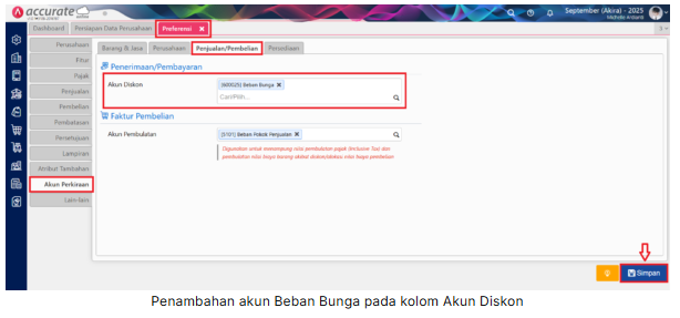 1. Menambahkan akun Beban Bunga melalui menu Pengaturan | Preferensi | Akun Perkiraan | Penerimaan/Pembayaran | Akun Diskon, lalu klik Simpan.