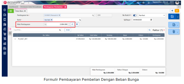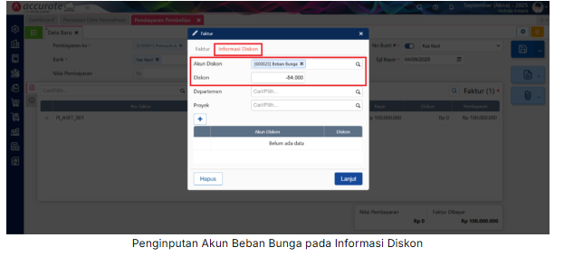 2. Lalu pada saat pembayaran cicilan dari menu Pembelian | Pembayaran Pembelian, pilih nama pemasok dan nomor faktur pembelian aset tersebut, kemudian isikan nilai cicilan yang akan dibayar yaitu sebesar Rp 2.000.000 pada kolom Bayar, lalu ke tab Informasi Diskon. Pilih akun Beban Bunga pada kolom Akun Diskon dan isikan nilai Bunga yang dibayarkan dengan tanda minus () pada kolom Diskon, sebesar -54.000 kemudian klik ‘Lanjut’.