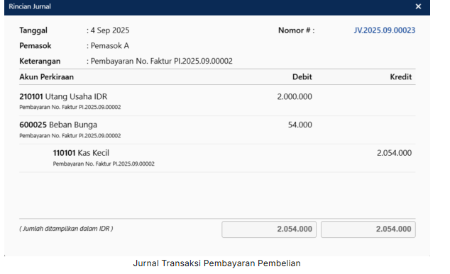 4. Simpan transaksi Pembayaran Pembelian tersebut, sehingga untuk jurnal yang terbentuk adalah seperti contoh berikut ini,