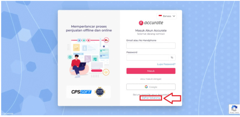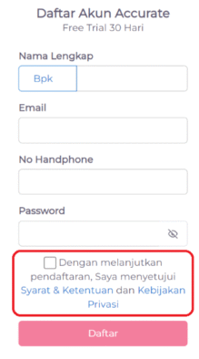 - Klik centang pada kotak Dengan melanjutkan pendaftaran, Saya menyetujui [Syarat & Ketentuan](Syarat & Ketentuan Umum Accurate Online – CPSSoft) dan [Kebijakan Privasi](Kebijakan Privasi – CPSSoft)