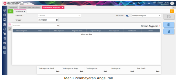 • No. Form: merupakan nomor urut transaksi atas transaksi Pembayaran Angsuran yang terisi otomatis sesuai dengan pengaturan pada menu Pengaturan | Penomoran. Atau bisa diisikan secara manual setiap kali menginput transaksi Pembayaran Angsuran.