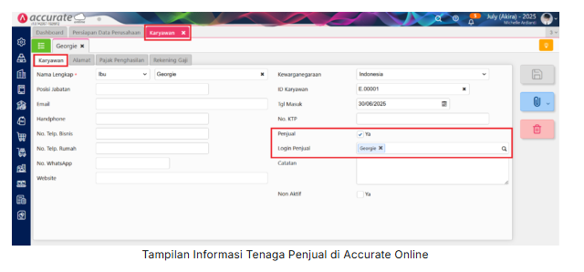 Catatan: Pastikan pengguna yang akses aplikasi Accurate Lite ini sudah dilakukan centang Penjual dan inputkan informasi Login Penjual nya, pada menu Perusahaan | Karyawan | Pilih Karyawan | Karyawan | Penjual, centang informasi ‘Ya‘, dan inputkan Login Penjual di database Accurate Online nya.