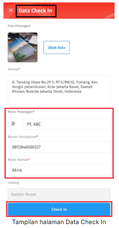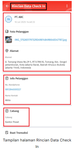 6. Terakhir, pengguna bisa melakukan pengecekan atas Check In yang dilakukan, dengan cara ke menu Check In | Daftar Check In, pilih data check in yang dimaksud | Rincian Data Check In, dan akan tampil beberapa informasi seperti Nama PelangganFoto PelangganAlamatInfo Pelanggan (No. Handphone dan Nama Kontak), Cabang, dan Buat Transaksi.