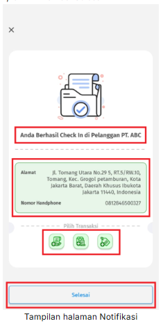 5. Jika pengguna sudah berhasil Check In, maka akan tampil notifikasi ‘Anda Berhasil Check In di [Nama Pelanggan]‘, dan informasi lainnya seperti Alamat dan Nomor Handphone Pelanggan. Selain itu, pada halaman notifikasi akan menampilkan beberapa ikon menu, seperti Penawaran PenjualanPesanan Penjualan, dan Faktur Penjualan, lalu klik tombol Selesai.