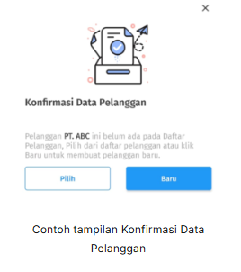 • Selanjutnya, akan tampil notifikasi Konfirmasi Data Pelanggan, seperti ‘[Nama Pelanggan] ini belum ada pada Daftar Pelanggan, Pilih dari daftar pelanggan atau klik Baru untuk membuat pelanggan baru‘, lalu klik tombol Pilih atau Baru.