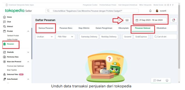 Silakan masuk https://seller.tokopedia.com/ kemudian pilih ‘Pesanan’ lalu pilih ‘Semua Pesanan’ jika Anda ingin melakukan semua transaksi penjualan (selesai atau masih dalam proses pengiriman) atau pilih ‘Pesanan Selesai’ jika Anda hanya ingin mengimpor transaksi penjualan yang sudah selesai saja.