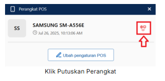 Pada database Accurate Online, akses menu Accurate POS | Pengaturan POS. Pilih nama Outlet yang mengalami kendala saat proses pengunduhan data, lalu klik Putuskan Perangkat