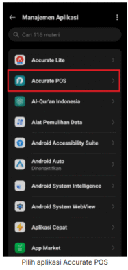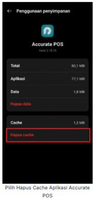 2. Pada perangkat android Anda lakukan Hapus Cache aplikasi Accurate POS. Biasanya bisa dilakukan dengan akses menu Pengaturan | Aplikasi, lalu pilih Managemen Aplikasi, selanjutnya pilih aplikasi Accurate POS | klik Penggunaan penyimpanan, lalu klik Hapus Cache.