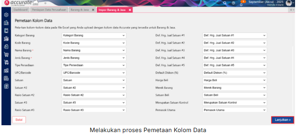 – Pilih file Excel yang ingin diimpor, lalu klik Unggah. Pada bagian Pemetaan Kolom Data, lakukan proses pemetaan data, dan klik Lanjutkan.