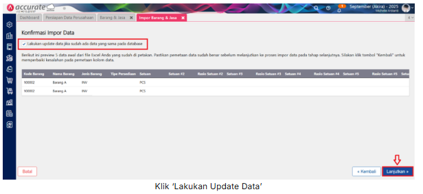 – Selanjutnya, pada bagian Konfirmasi Impor Data centang informasi ‘Lakukan update data dan simpan saldo awal sebagai tambahan saldo baru jika sudah ada data yang sama pada database‘, lalu klik Lanjutkan.