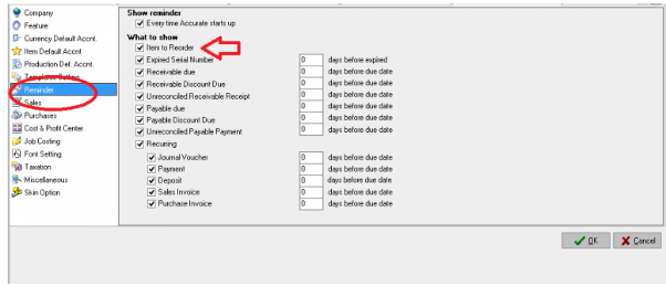 Pertama, pastikan kalau setting-an Reminder untuk Reorder Qty sudah diaktifkan. Untuk memastikannya, masuk ke menu Setup | Preferences | Reminder. Pastikan kalau box “Item to Reorder” sudah diceklis.
