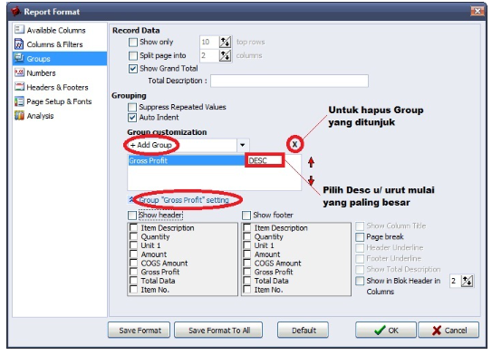 - Masih di Report Format | Group, hapus Group Amount dengan cara klik sekali dibaris Amount lalu klik button X di kanan atas. Setelah itu Add Group pilih Gross Profit(Laba Kotor), disamping Gross Profit ganti ASC menjadi DESC. Masih menunjuk ke baris group Gross Profit, klik Setting dibagian bawah, Uncheck untuk Show Header dan Show Footer.