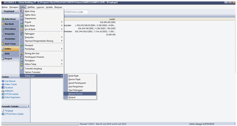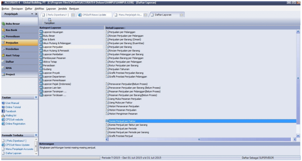 Untuk melihat laporan komisi per salesman di software akuntansi ACCURATE Indonesia bisa kita lihat dari menu Laporan (Report), Daftar Laporan (Index to Report), Laporan Penjualan (Sales Report), di sebelah kanan tinggal kita pilih jenis laporan komisi salesman yang hendak kita lihat.
