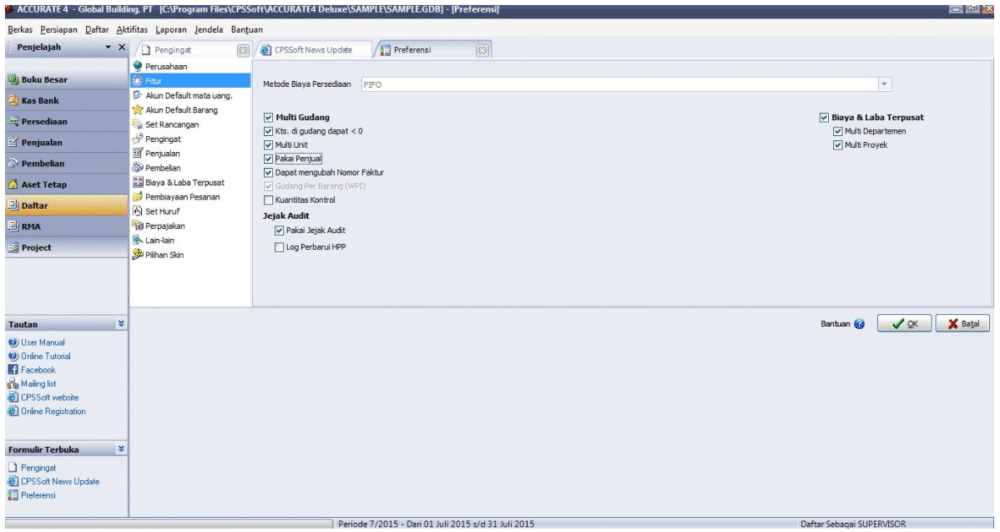 Untuk mengaktifkan fitur salesman ini kita masuk ke menu Persiapan (Setup), Preferensi (Preference), Fitur (Feature). Klik / centang di field “Pakai Penjual”. Lalu klik OK.