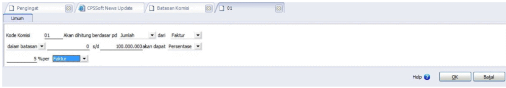 Klik tombol “Baru (New)” untuk membuat kode komisi baru. Isikan kode komisi yang akan kita buat, lalu pilih komisi akan dihitung berdasarkan Jumlah / kuantitas / laba kotor dari Faktur / Barang, dalam batasan berapa sampai berapa, akan dapat persentase / nilai tetap per Faktur / Periode. Lalu klik OK untuk menyimpan.