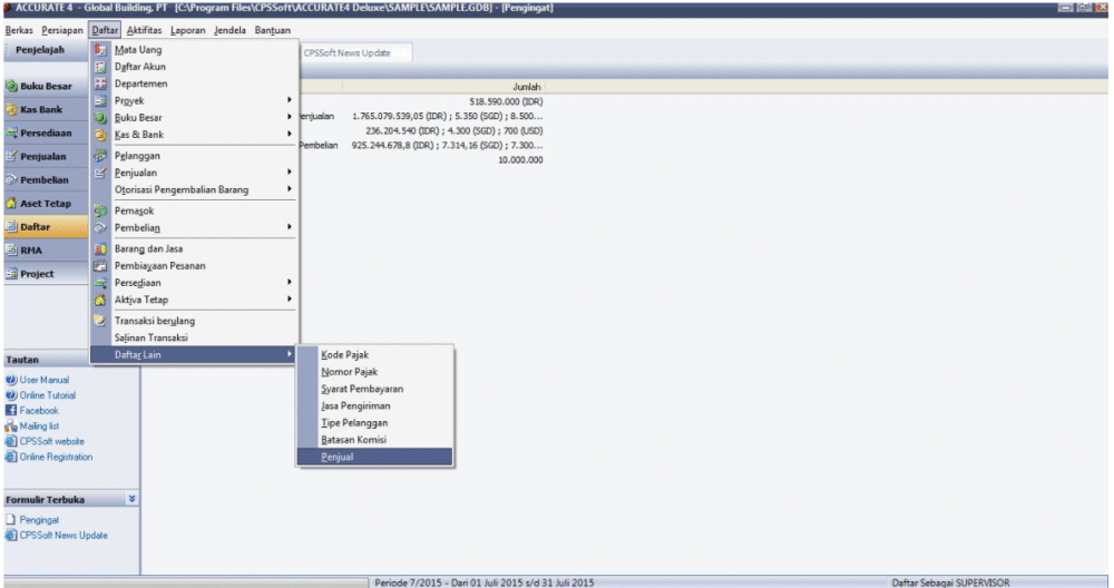 Kemudian untuk membuat nama salesman di software akuntansi ACCURATE bisa kita input dari Menu Daftar (List), Daftar Lain (Others), Penjual (Salesman).