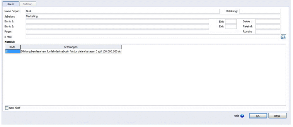 Klik tombol “Baru (New)” untuk membuat nama salesman baru. Isikan nama salesman, jabatan (bila ada), nomor telepon (bila ada), email (bila ada), dan pilih kode komisi yang berlaku untuk salesman tersebut. Klik OK untuk menyimpan nama salesman.