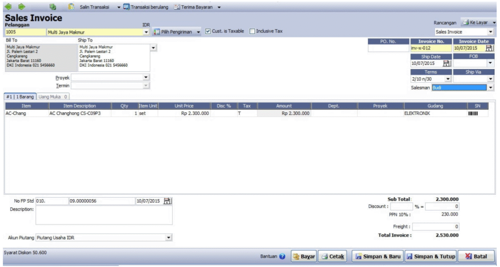 Lalu di setiap penjualan dari penawaran penjualan sampai faktur penjualan akan muncul kolom Salesman (Penjual). Isikan nama salesman di setiap penawaran / pesanan / faktur yang kita buat.