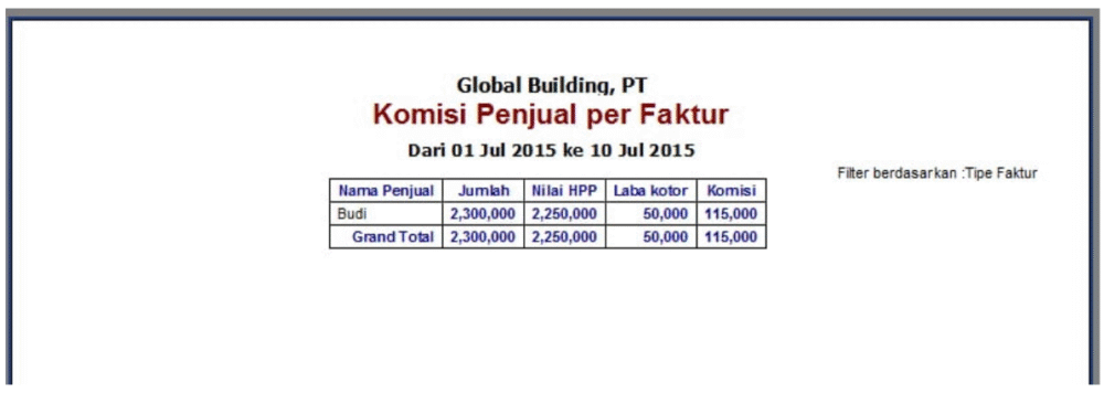 Maka akan tampil nilai komisi salesman kita di laporan tersebut, bila faktur atas penjualan salesman tersebut telah dilunasi oleh customer atau telah diinput penerimaan penjualannya di Software Akuntansi ACCURATE.
