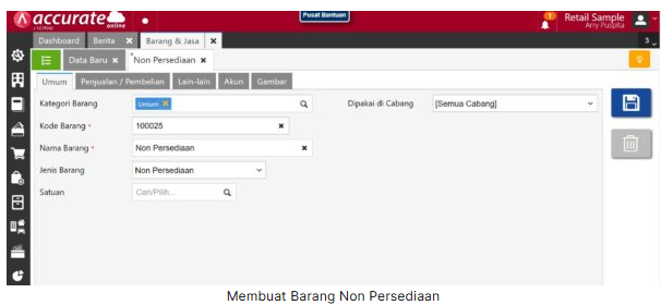 1. Buat barang baru dengan Jenis Barang adalah Non Persediaan melalui menu Persediaan | Barang dan Jasa.