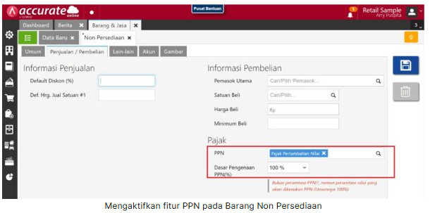 2. Ke tab Penjualan / Pembelian, aktifkan Pajak “PPN” kemudian ‘Simpan’.