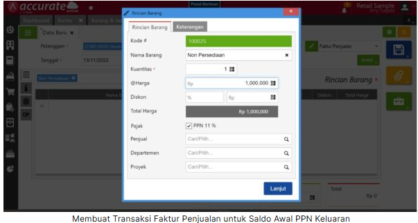 3. Selanjutnya buat transaksi Faktur Penjualan, melalui menu Penjualan | Faktur Penjualan, pilih Pelanggan atas transaksi PPN Keluaran tersebut, lalu pilih barang Non Persediaan yang telah dibuat di langkah 1 dan isikan Harga Barang dengan nilai DPP-nya lalu klik Lanjut.