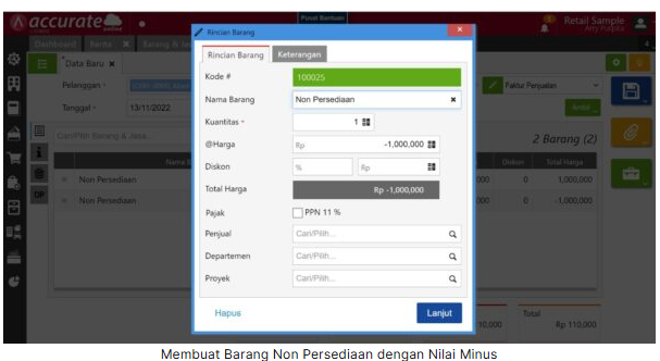 4. Masih di formulir Faktur Penjualan, pilih kembali barang Non Persediaan tersebut kemudian isikan harga barang-nya dengan nilai minus dari DPP, yaitu Rp – 1.000.000 dan jangan centang informasi ‘PPN’-nya lalu klik Lanjut