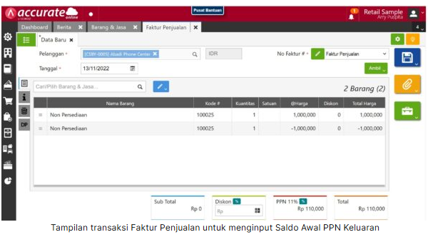 Ilustrasi : Ingin menginput nilai saldo awal PPN Keluaran sebesar Rp 110.000 dengan nilai DPP sebesar Rp 1.000.000 (Tarif PPN sebesar 11%) dan ingin nilai PPN tersebut bisa tampil dalam SPT Masa PPN/PPNBM di Accurate Online.