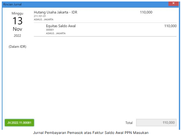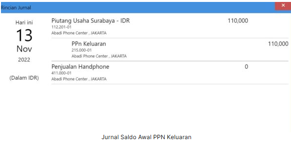 Catatan : untuk saldo awal PPN Masukan (transaksi pembelian) bisa dilakukan dengan cara yang sama, namun pada langkah ke-3 dan seterusnya lakukan penginputan transaksi melalui formulir Faktur Pembelian melalui menu Pembelian. Sehingga jurnal yang terbentuk akan seperti berikut ini. Dan dengan jurnal secara keseluruhan menjadi PPN Masukan (Dr) pada Equitas Saldo Awal (Cr).
