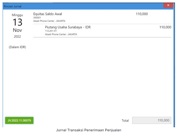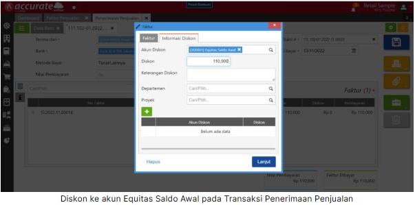 7. Langkah terakhir adalah membuat transaksi Penerimaan Penjualan atas Faktur Penjualan tersebut, lakukan diskon penerimaan ke akun Equitas Saldo Awal sehingga jurnal yang terbentuk adalah sebagai berikut.