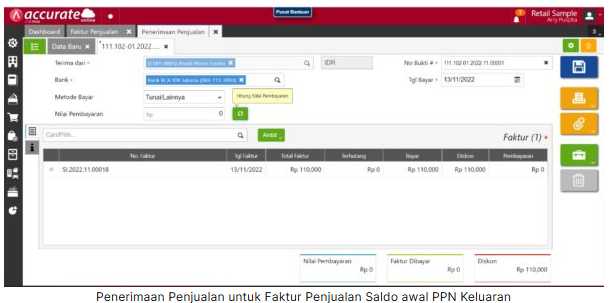 5. Sehingga pada formulir Faktur Penjualan tersebut akan tampil senilai PPN-nya saja yaitu sebesar Rp 110.000 (lihat gambar)