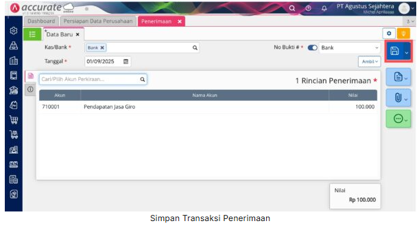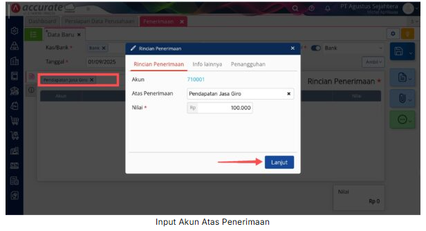 2. Pilih Kas/Bank dan atur Tanggal, lalu pada kolom Cari/Pilih Akun Perkiraan, tentukan akun yang akan menjadi lawan kas atau bank. Contoh jika Anda ingin mencatat pendapatan jasa giro, maka carilah akun Pendapatan Jasa Giro. Isi pada bagian Nilai, pendapatan giro yang diterima. Selanjutnya klik Lanjut, dan lakukan langkah yang sama untuk memilih akun pendapatan berikutnya (jika ada).