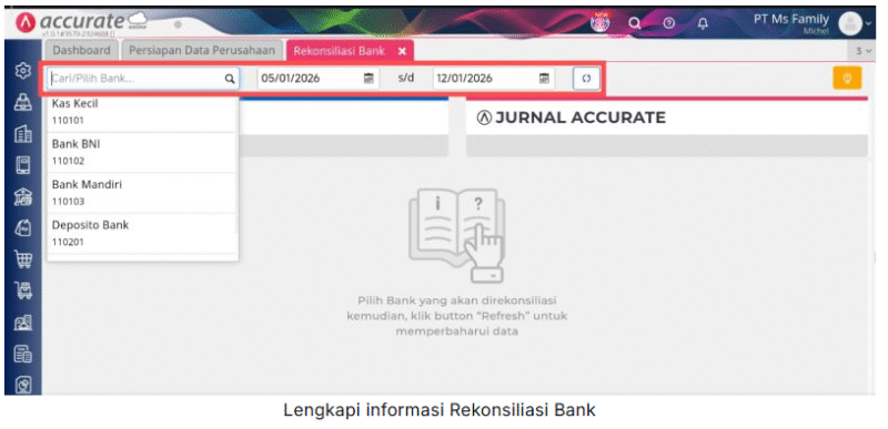 2. Tentukan akun bank yang akan direkonsiliasi, lalu akan ditampilkan oleh Accurate Online nilai yang ada pada Histori Bank (Accurate)