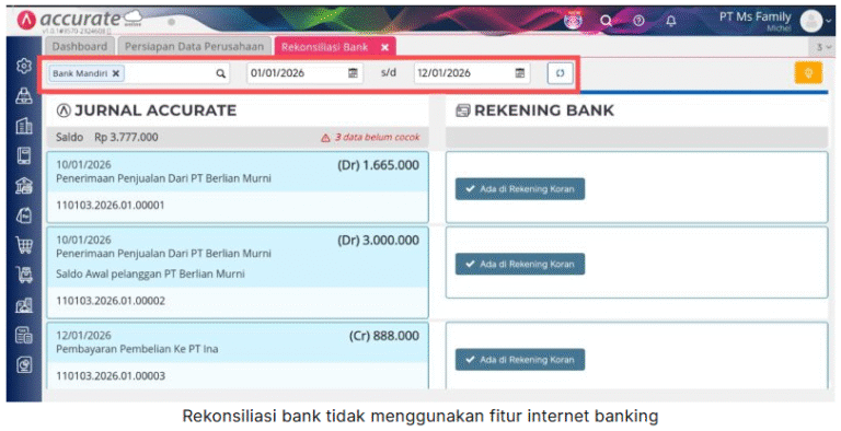 7. Setelah Anda klik Cocok, maka transaksi yang sudah dikonfirmasi akan hilang dari tampilan Rekonsiliasi Bank.