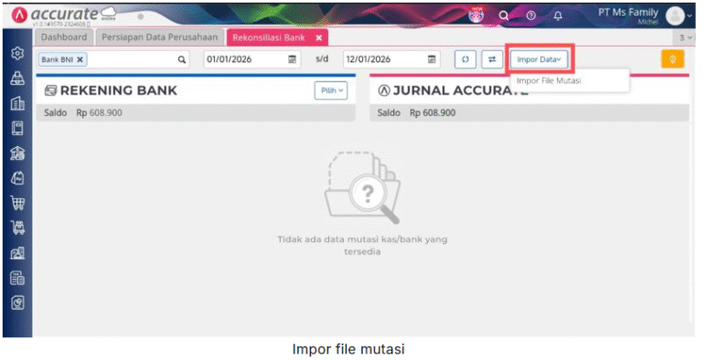 4. Jika Anda menggunakan fasilitas Internet Banking, maka klik tombol Impor Data kemudian pilih “Impor File Mutasi”. Impor File Mutasi dengan dengan file .xls.