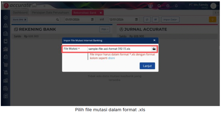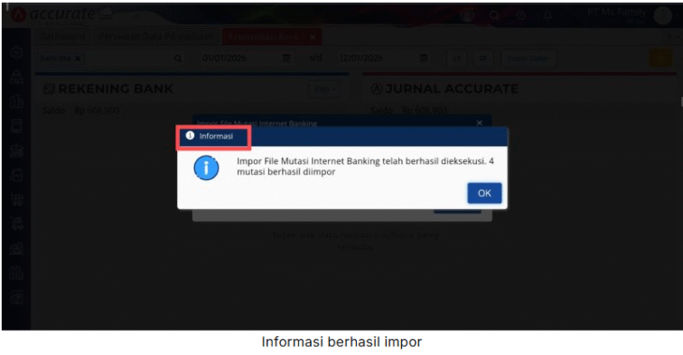 5. Klik Lanjut dan tunggu sampai ada konfirmasi ‘Impor Internet Banking telah berhasil di eksekusi’, yang menandakan proses impor transaksi telah berhasil dilakukan dan transaksi pada kolom Rekening Koran akan terisi sesuai dengan rekening koran pada Bank yang telah anda Impor.