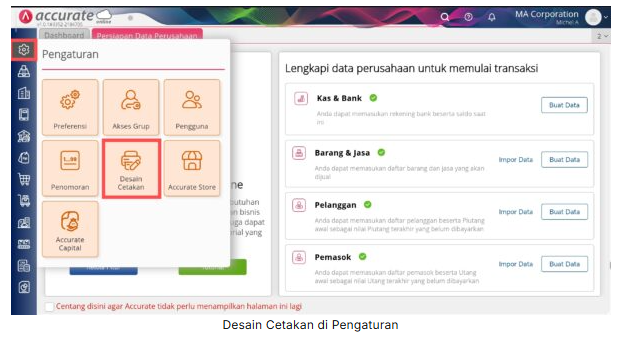 1. Akses ke menu Pengaturan | Desain Cetakan
