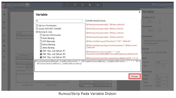 4. Pada tampilan desainer, klik 2 kali pada variabel Diskon, dan ubah skrip/rumusnya menjadi sebagai berikut.