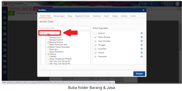 2. Pada tampilan laporan Penjualan per Barang, silahkan buka menu “Modifikasi”