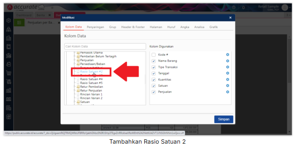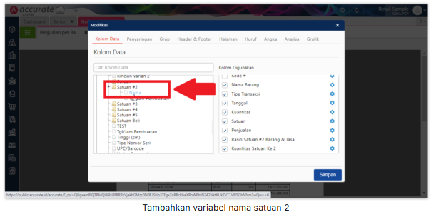 3. Pada “Kolom Tersedia”, silahkan buka folder “Barang dan Jasa”, klik 2x pada variabel “Rasio Satuan #2” dan buka folder “Satuan #2” lalu klik 2x pada variabel “Nama” dan tambahkan juga variable “Kolom Skrip Khusus 1”.