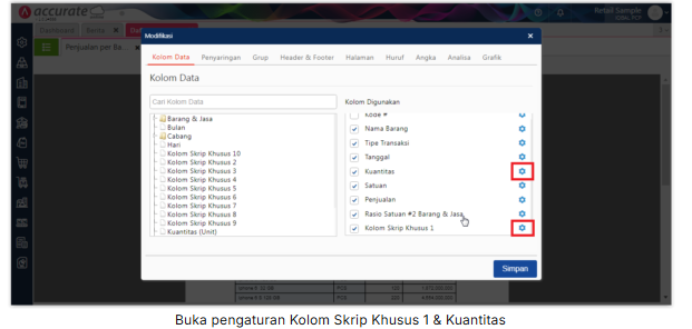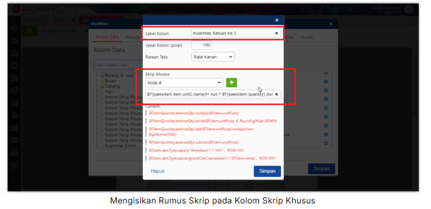 4. Kemudian di bagian “Kolom Digunakan”, klik icon gear pada variable “Kolom Skrip Khusus 1”, ubah label kolom menjadi “Kuantitas Satuan Ke 2”, dan isikan rumus skrip berikut ini : $F{salesItem.item.unit2.name}!= null ? $F{salesItem.quantity}.divide($F{salesItem.item.ratio2}, 6, RoundingMode.DOWN) : new BigDecimal(0)