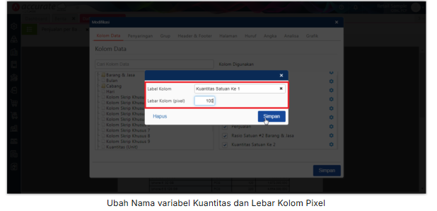 5. Klik icon gear biru di variable “Kuantitas”, ubah label kolom menjadi “Kuantitas Satuan Ke 1” dan ubah lebar kolom (pixel) menjadi 100.