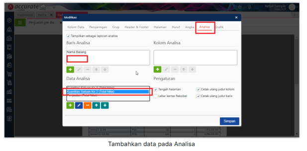 6. Klik tab “Analisa”, pada “Baris Analisa”, hapus variable “Satuan” dan pada “Data Analisa”, tambahkan variable “Kuantitas Satuan Ke 2” lalu posisikan dibawah variable “Kuantitas Satuan Ke 1” kemudian Simpan.