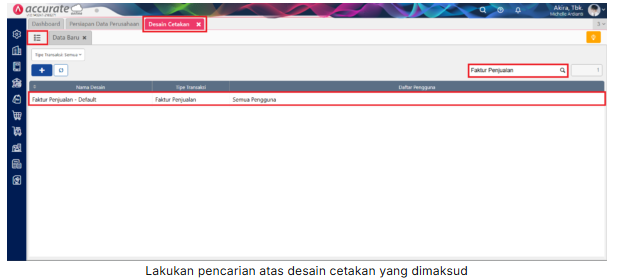1. Ke menu Pengaturan | Desain Cetakan, lalu klik tombol Daftar berwarna hijau di samping tab Data Baru, dan lakukan pencarian atas desain cetakan yang dimaksud, misal Faktur Penjualan.
