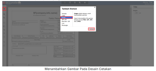 4. Namun jika anda menggunakan Layout Dasar selain Default, untuk menambahkan Logo/Gambar pada Desain Cetakan Faktur Penjualan, klik  ‘Tambah Elemen’ (icon +) kemudian pilih ‘Image’ lalu klik ‘Tambah’ dan letakan pada posisi yang sesuai.